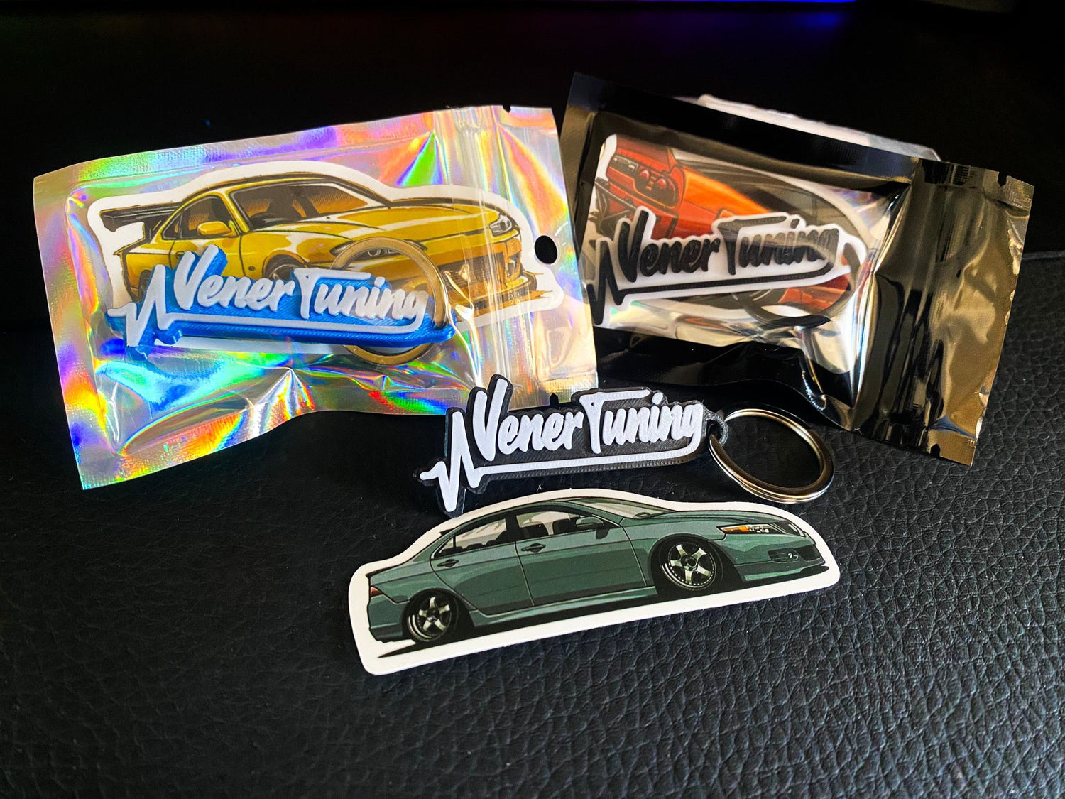 Most of the works I have been commissioned to do are personalized keychains with writings, logos or symbols of all kinds. On the side you can see some keychains made for the VenerTuning IG page with free tuning stickers.